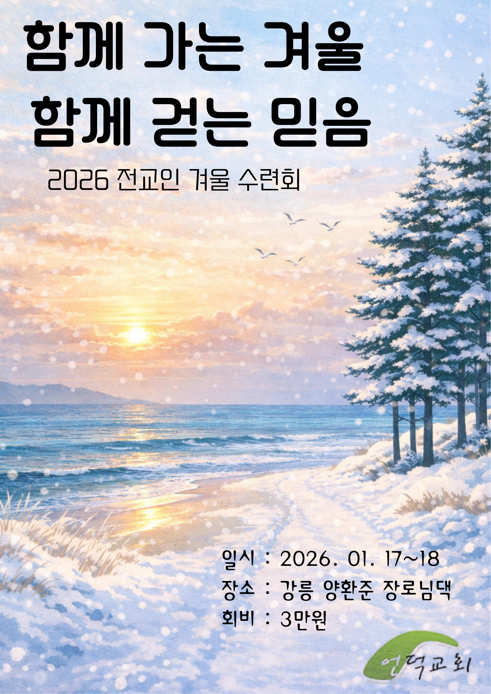 전교인겨울수련회 (1월 18일은 파고다에서 예배가 없습니다) 황지혜 2026.1.11 조회 260 1월 18일은 전교인수련회로 강릉에서 예배드리고, 파고다에서는 예배가 없습니다. 댓글 0